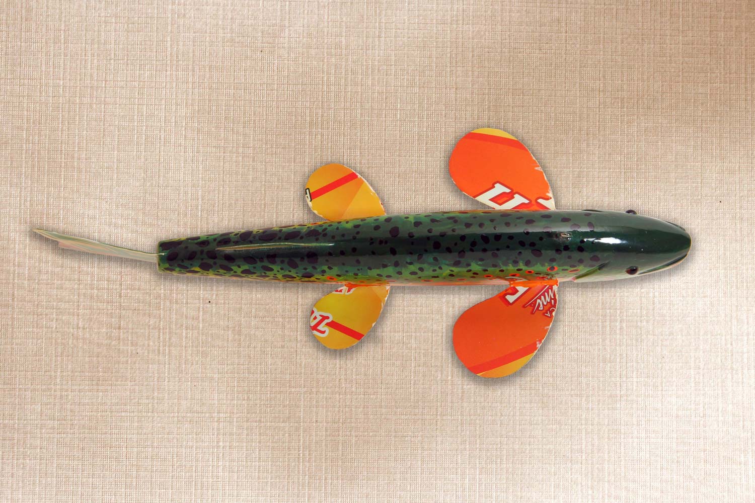 This fish is carved from basswood, Tin tail and fins, Glass eyes, Carved mouth and gills.