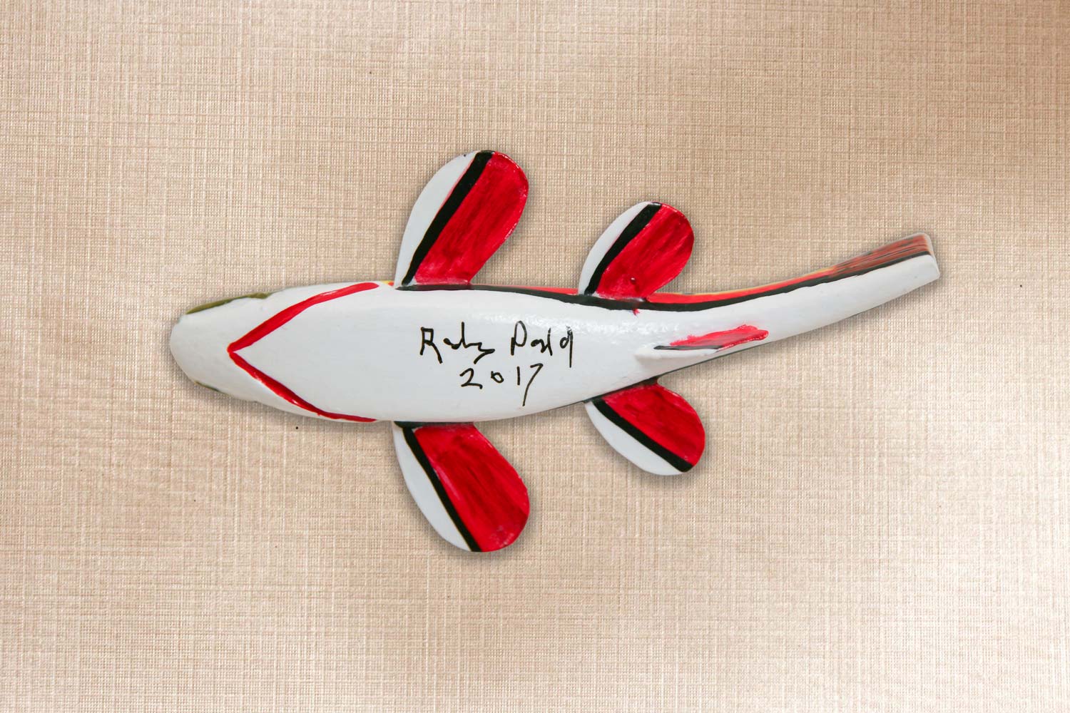 This fish is carved from basswood, Wood tail, Copper fins, Tack eyes Carved gills and mouth.