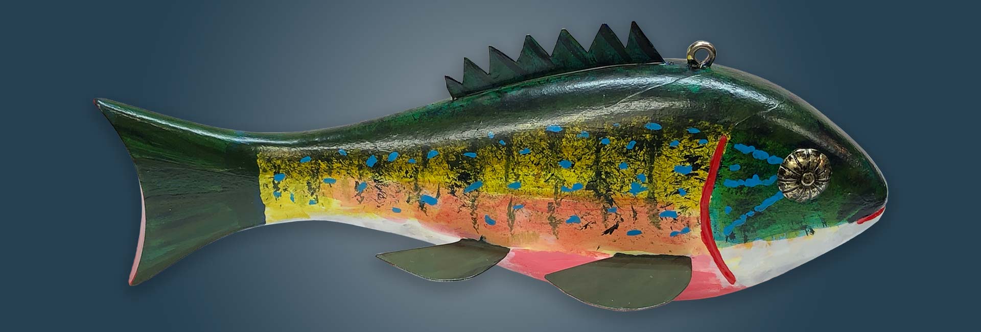 This fish is carved from basswood, Wood tail, Tin fins, Tack eyes, Carved mouth and gills.