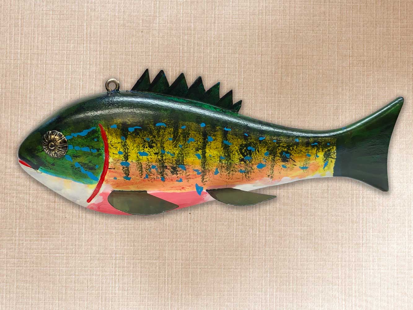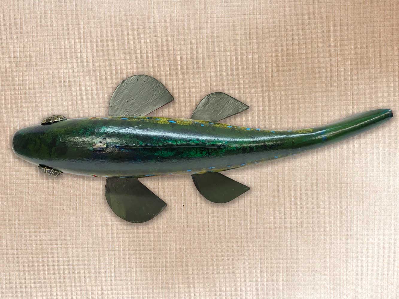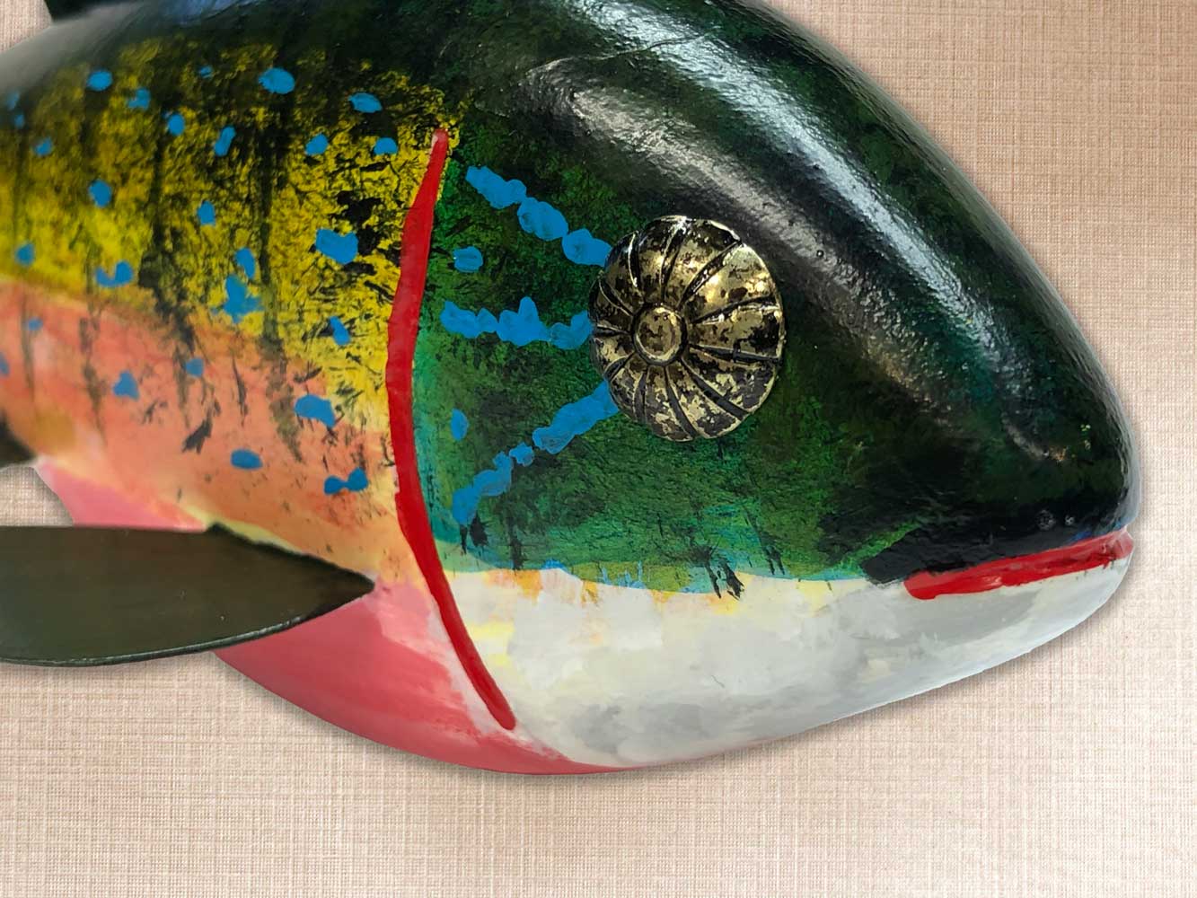 This fish is carved from basswood, Wood tail, Tin fins, Tack eyes, Carved mouth and gills.