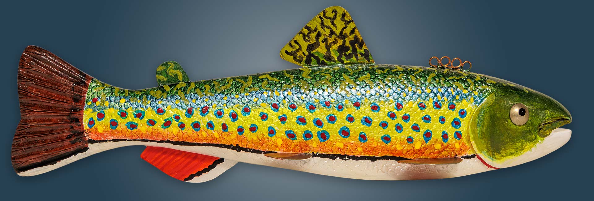 This fish is carved from basswood, Wood tail, Tin fins, Tack eyes, Scaled body, Carved mouth and gills.