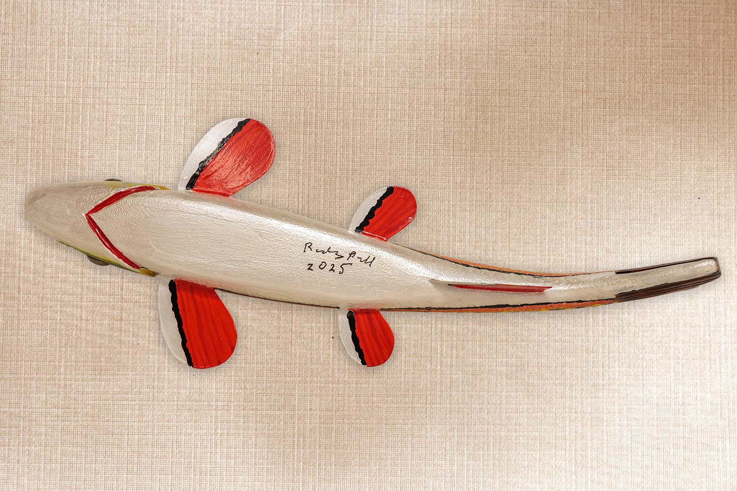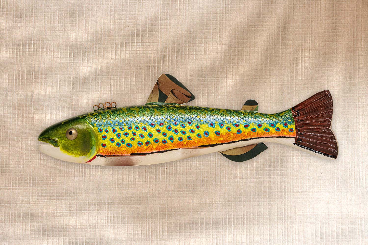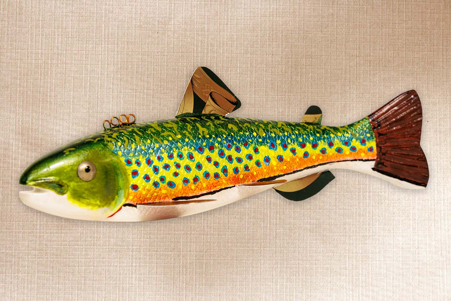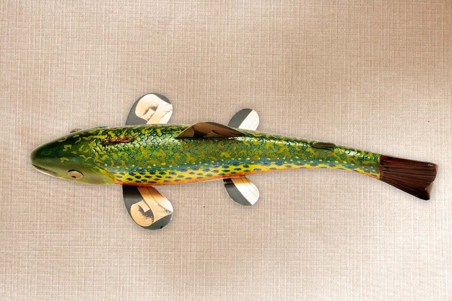 This fish is carved from basswood, Wood tail, Tin fins, Tack eyes, Scaled body, Carved mouth and gills.