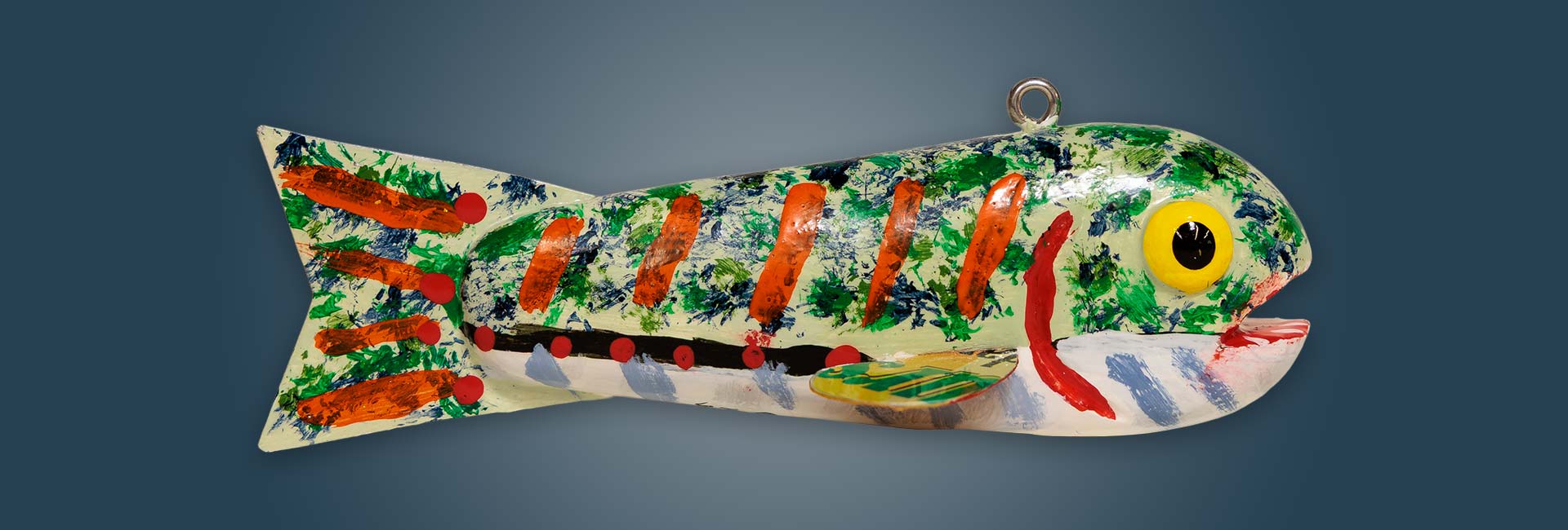 This fish is carved from basswood, Tin fins and tail, Painted tack eyes, Carved mouth and gills.