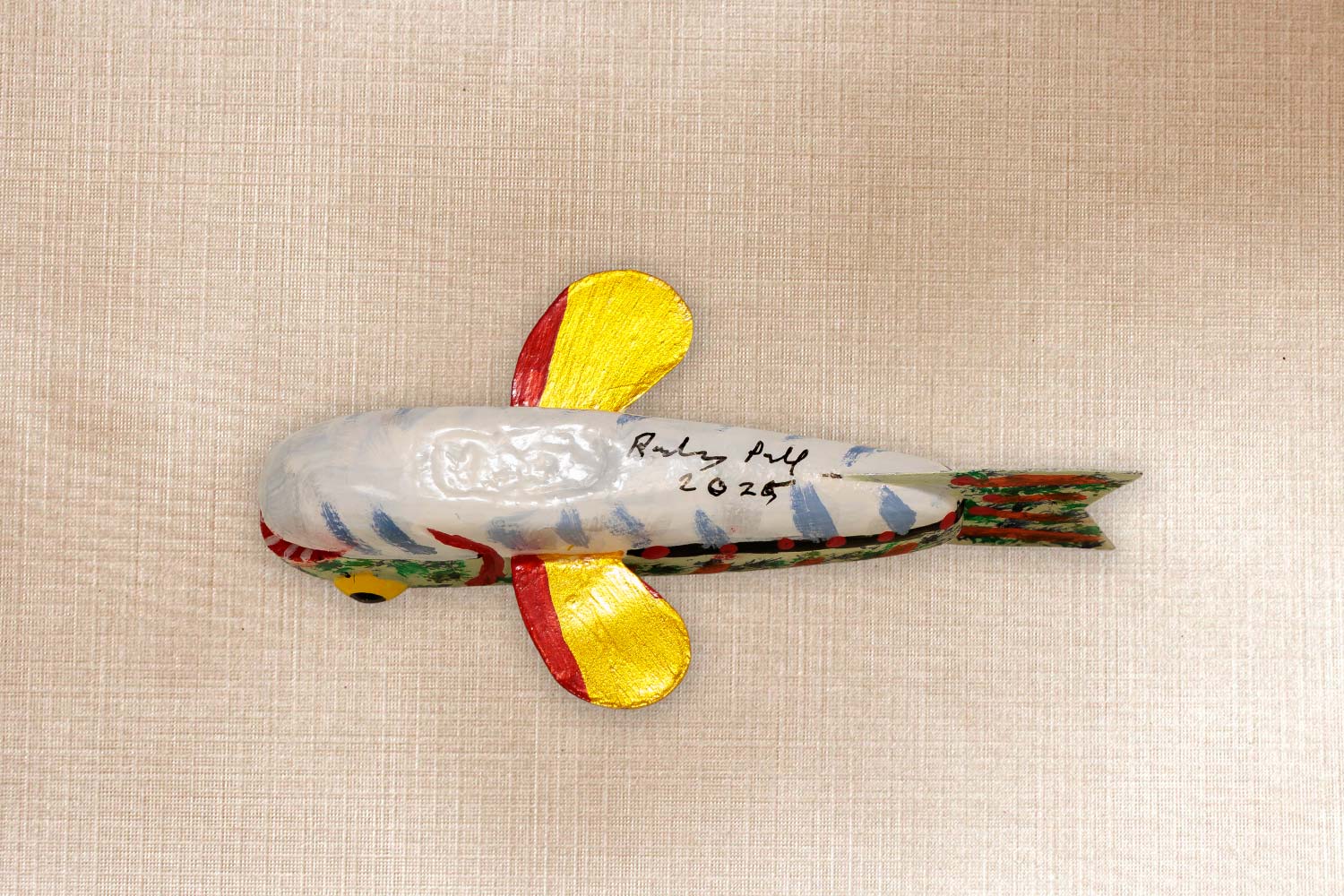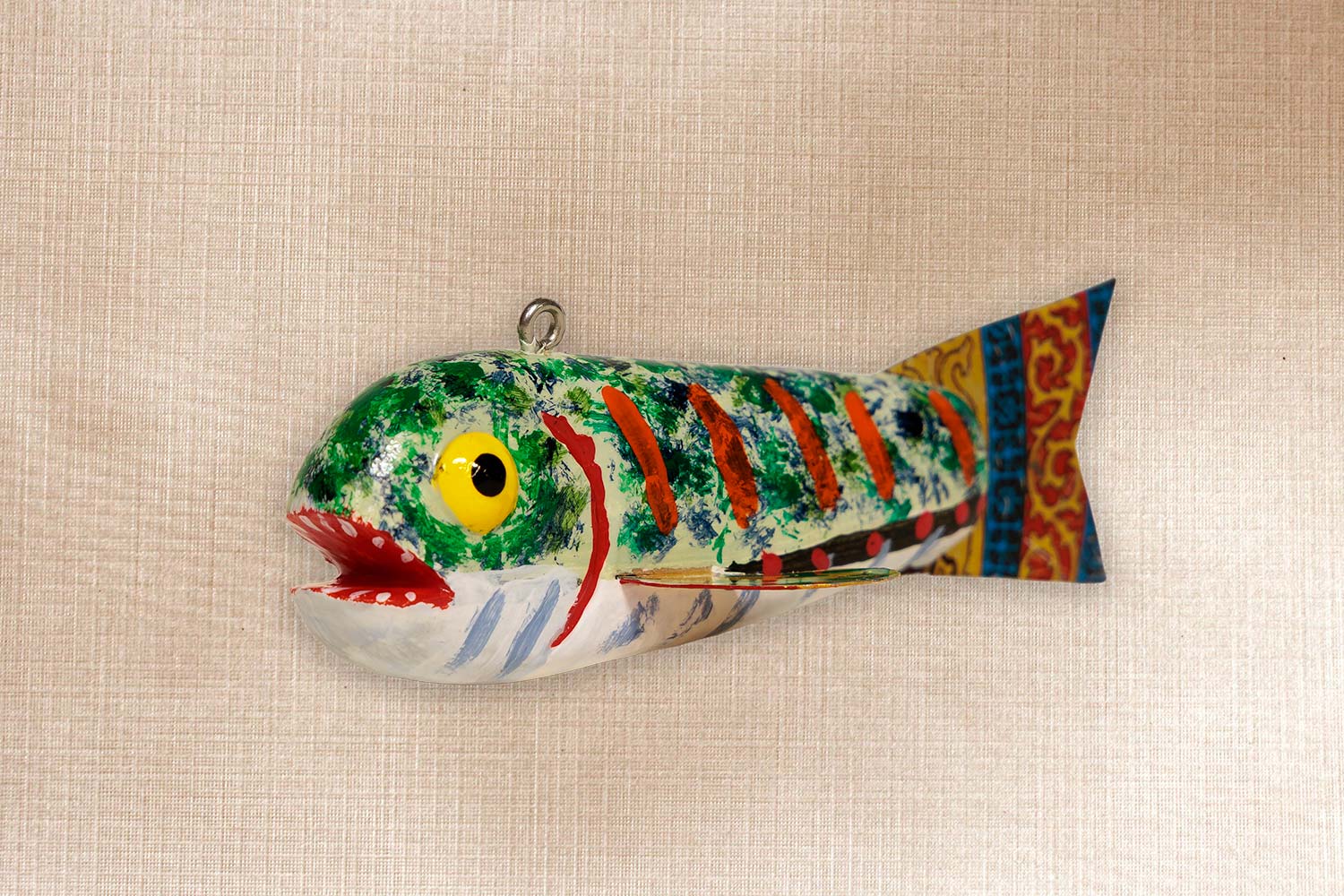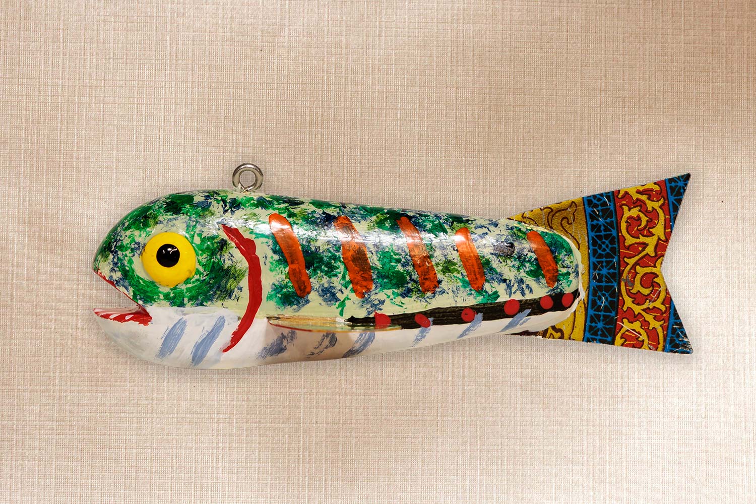 This fish is carved from basswood, Tin fins and tail, Painted tack eyes, Carved mouth and gills.