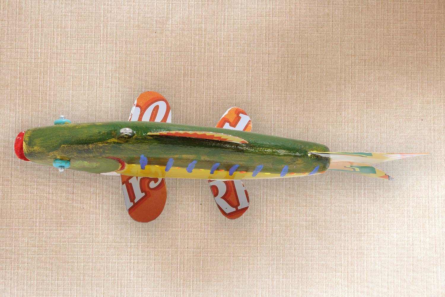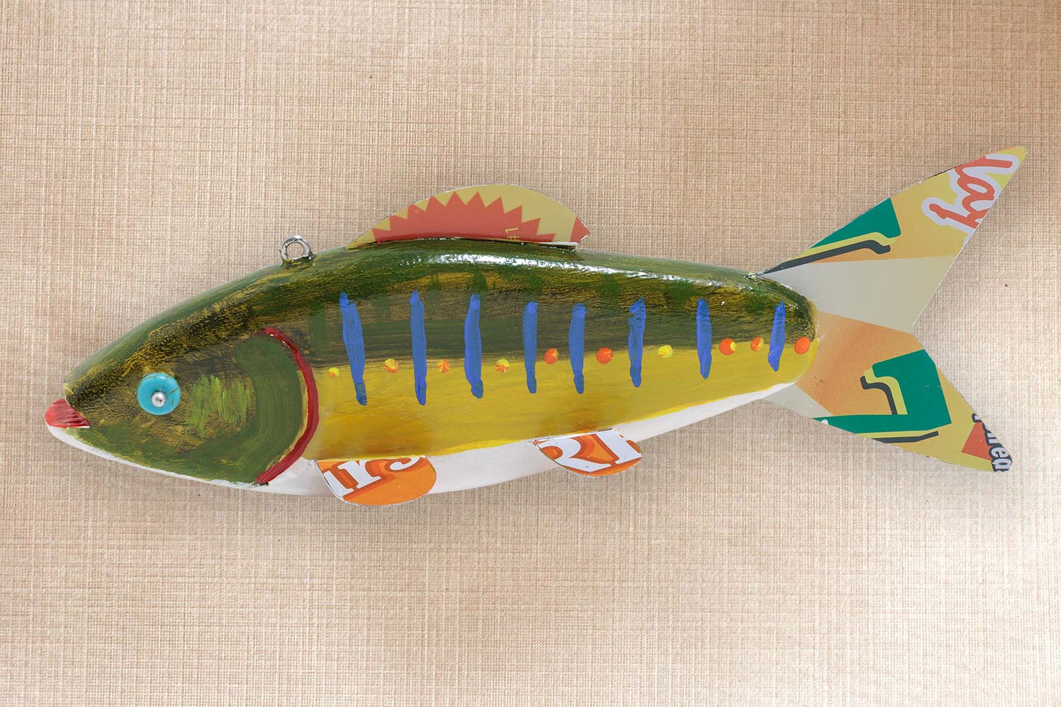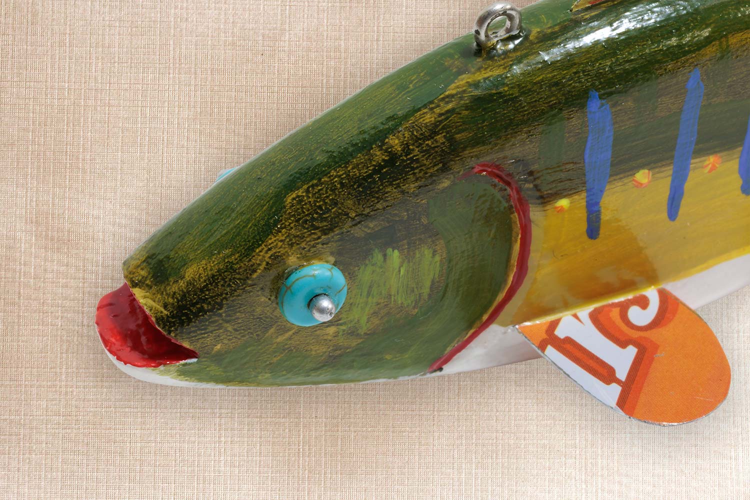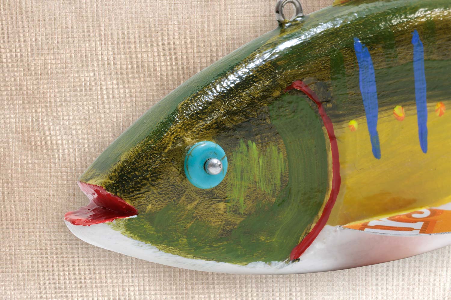 This fish is carved from basswood, Tin fins and tail, Painted Bead eyes, Carved mouth and gills.