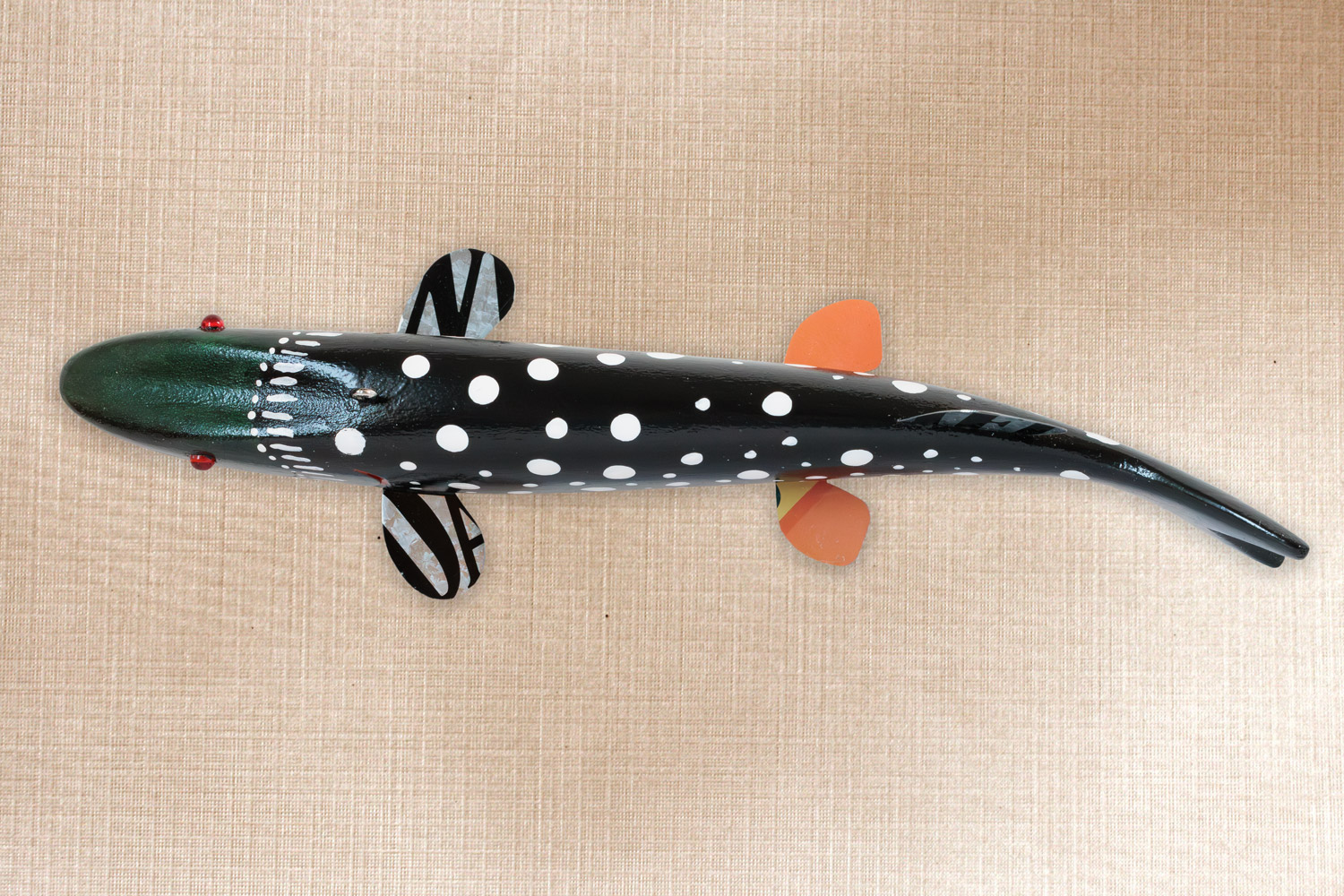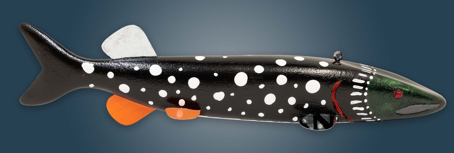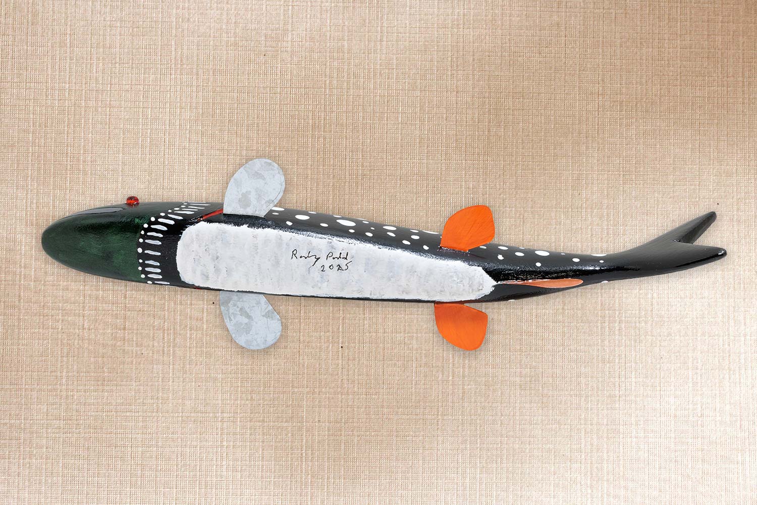 This fish is carved from basswood, Tin fins, Old beads from a lure for eyes, Carved mouth andgills, Painted to resemble a loon.