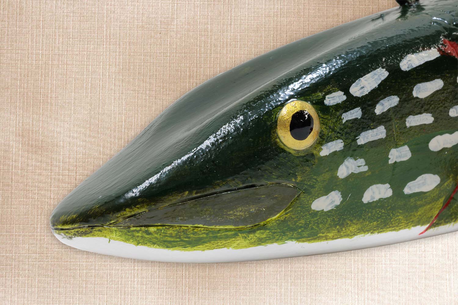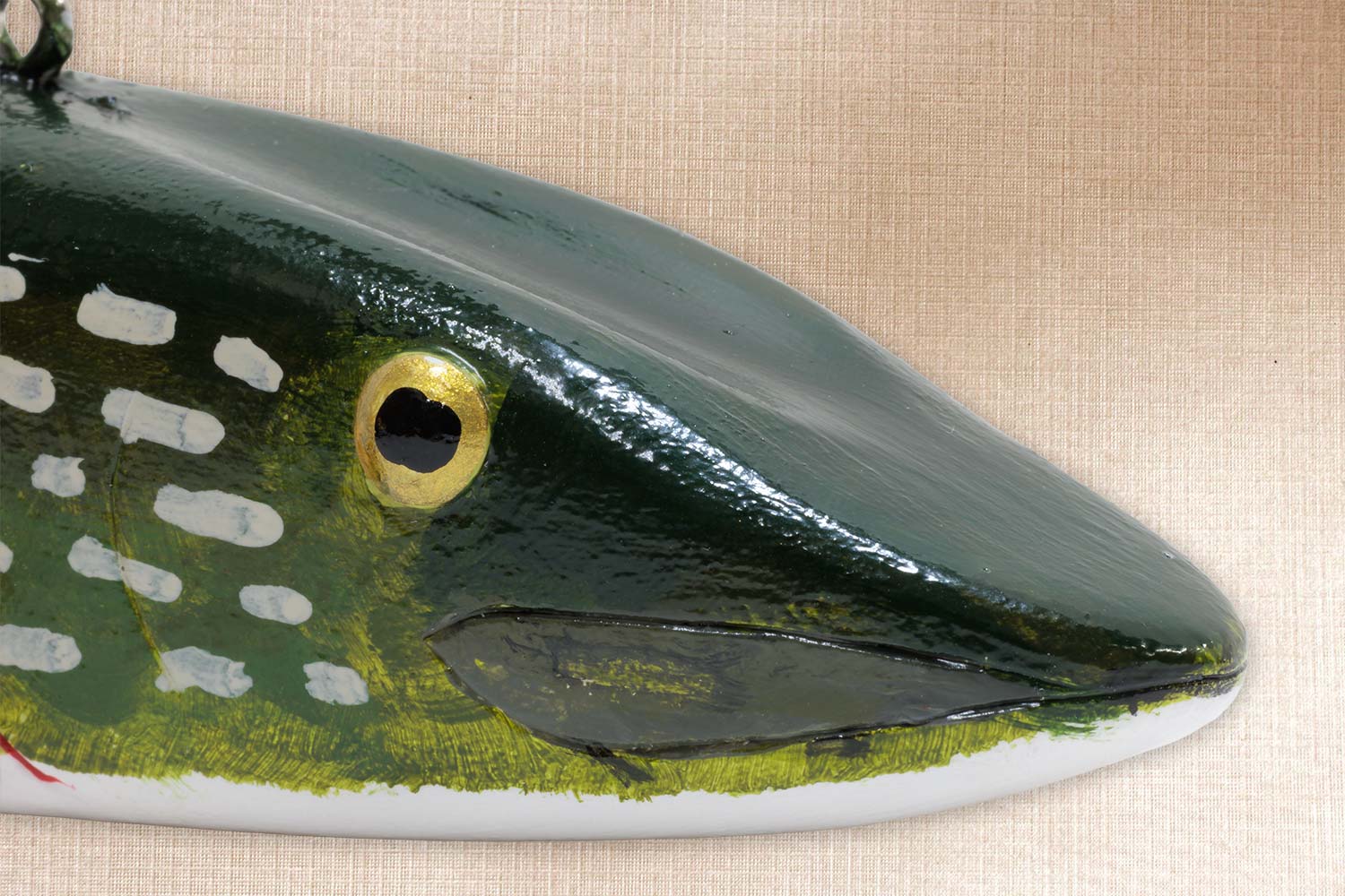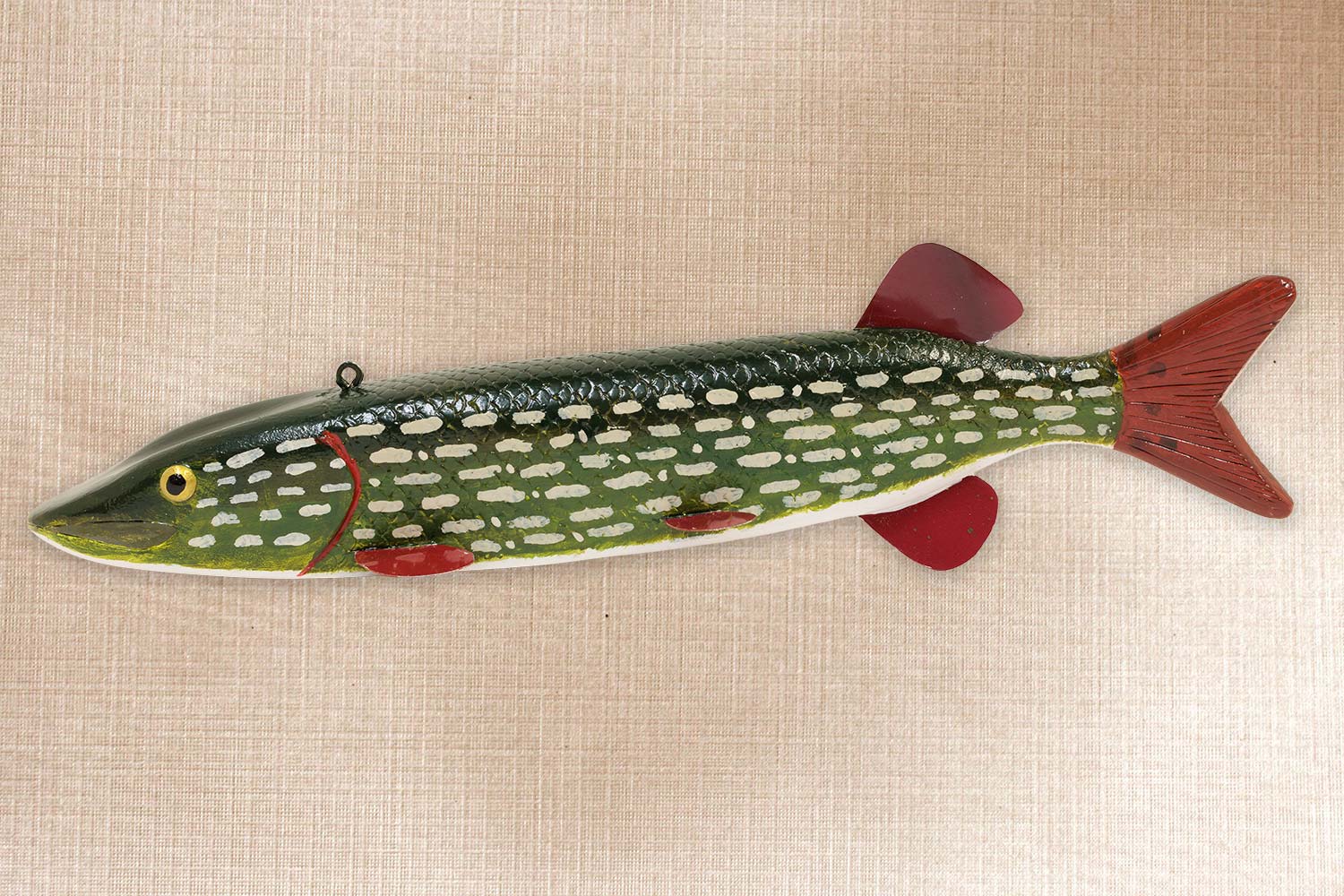 This fish is carved from basswood, Tin fins, Painted tack eyes, Carved mouth, gills and tail. Scaled body.