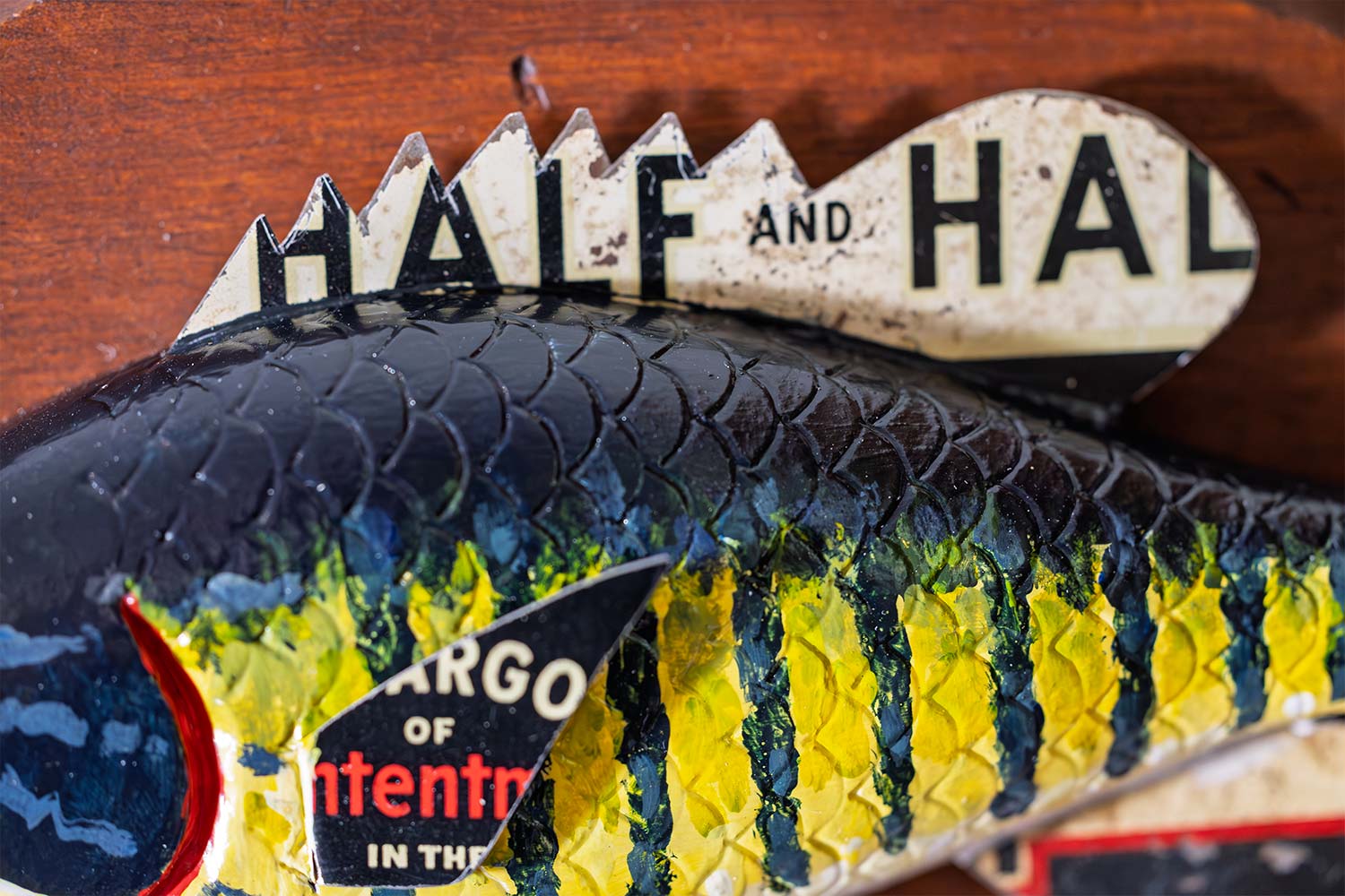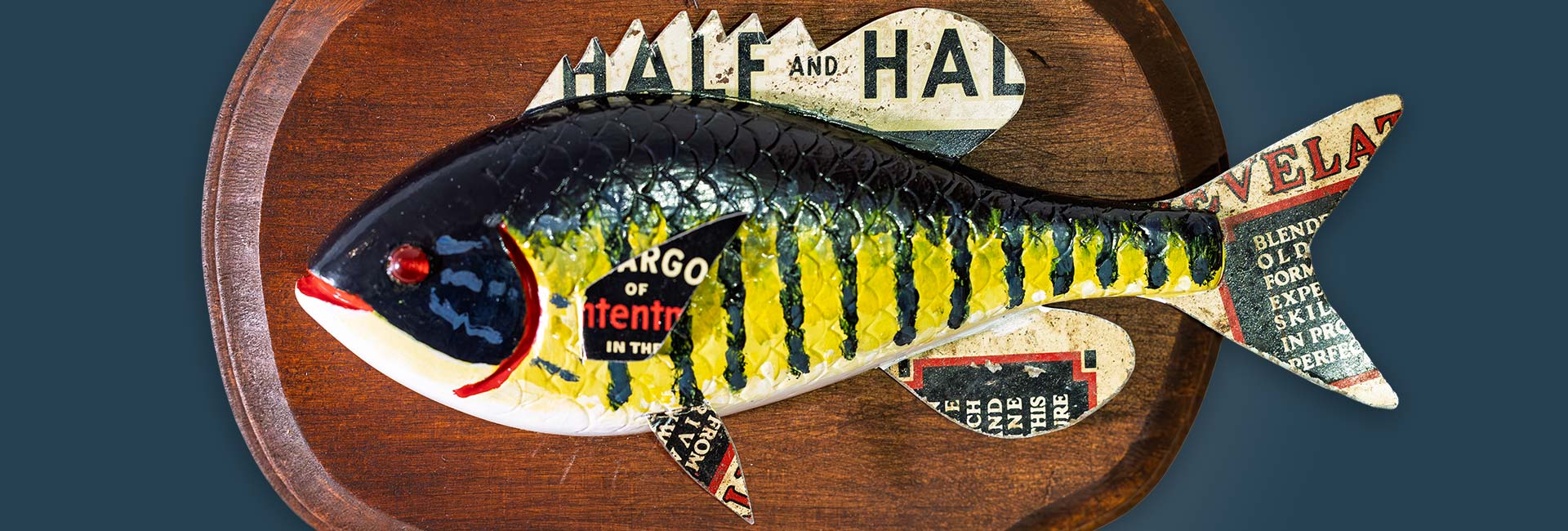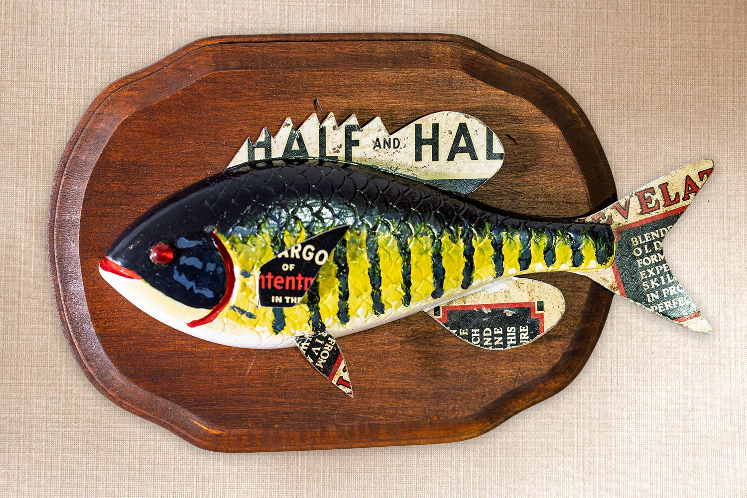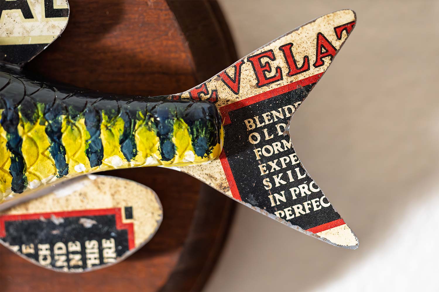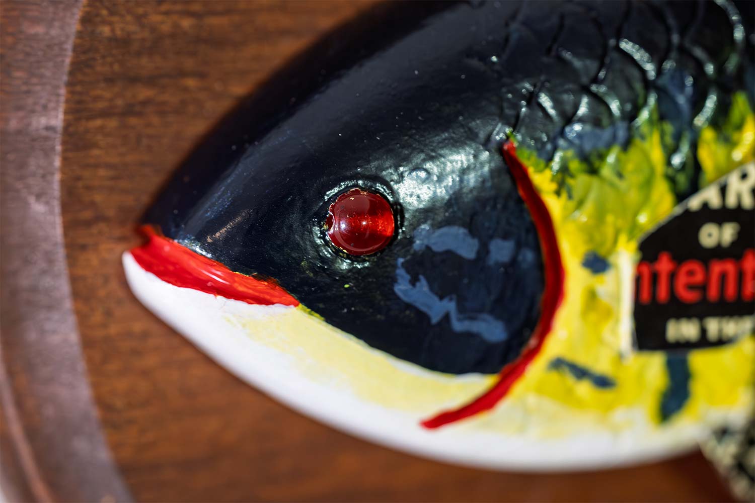 The bass is carved from basswood, glass bead eye, scaled, carved mouth and gills, tin fins and tail. Signed and dated on the back.