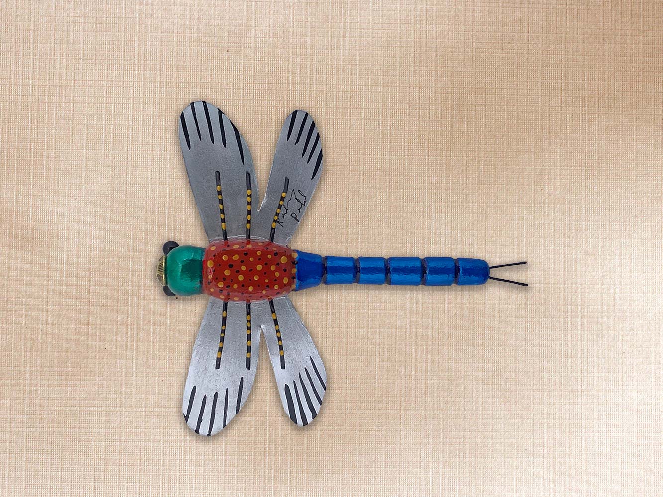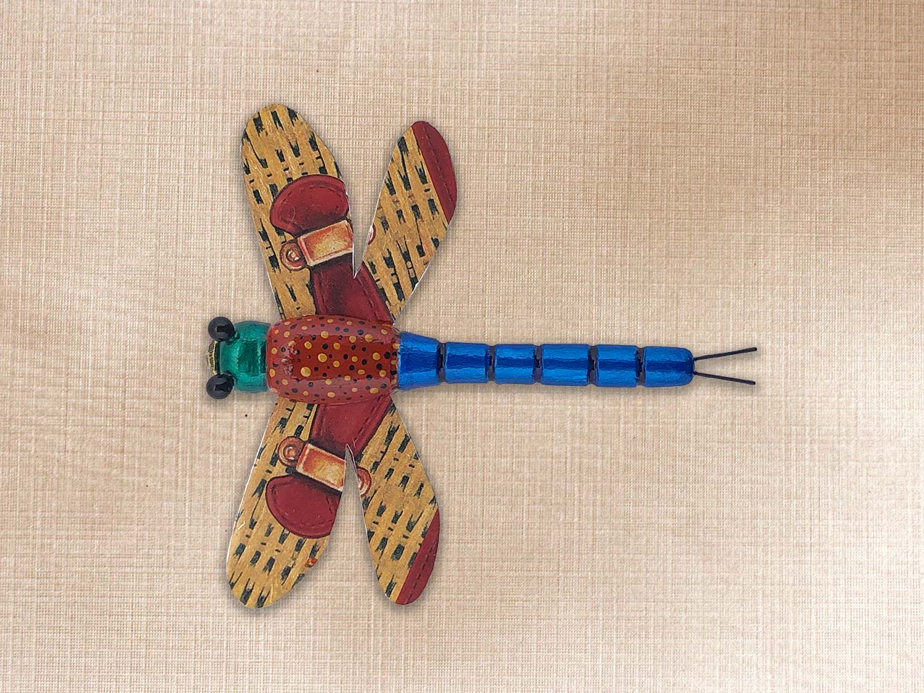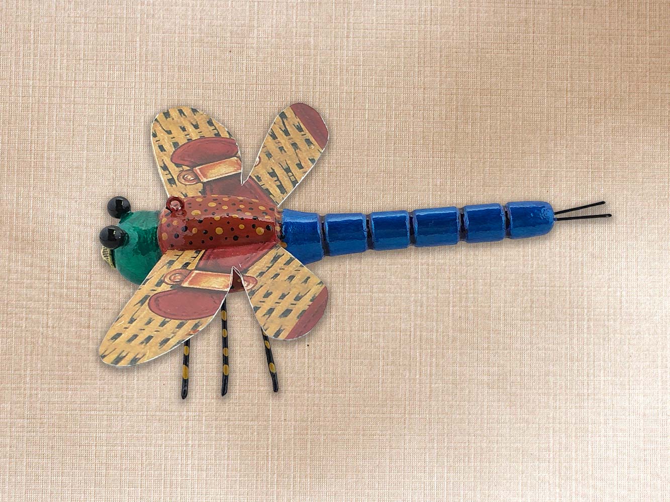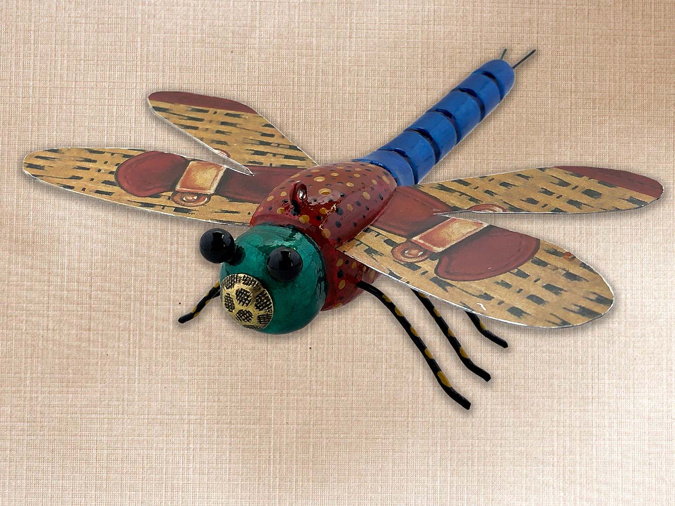 This dragonfly is carved from Basswood, Tin wings, Pin eyes, Tack nose, Brass wire legs.