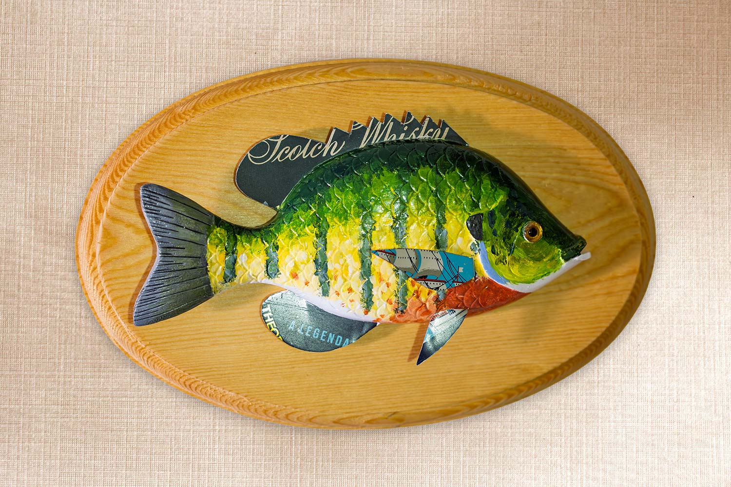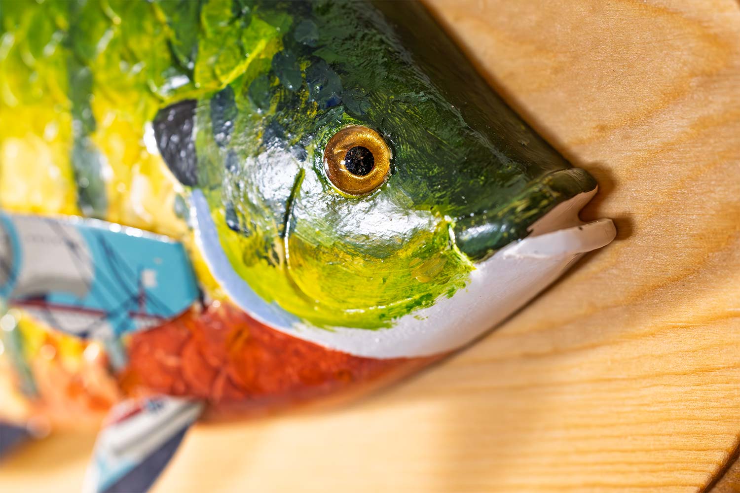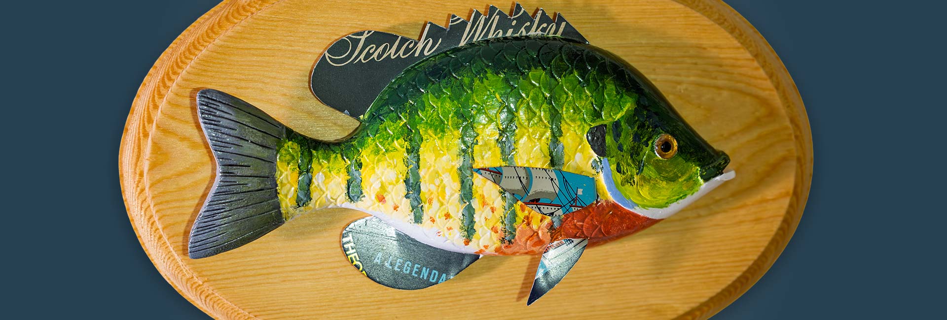 The bluegill is carved from basswood, glass eye, scaled, carved mouth, tail and gills, tin fins. Signed and dated on the back.