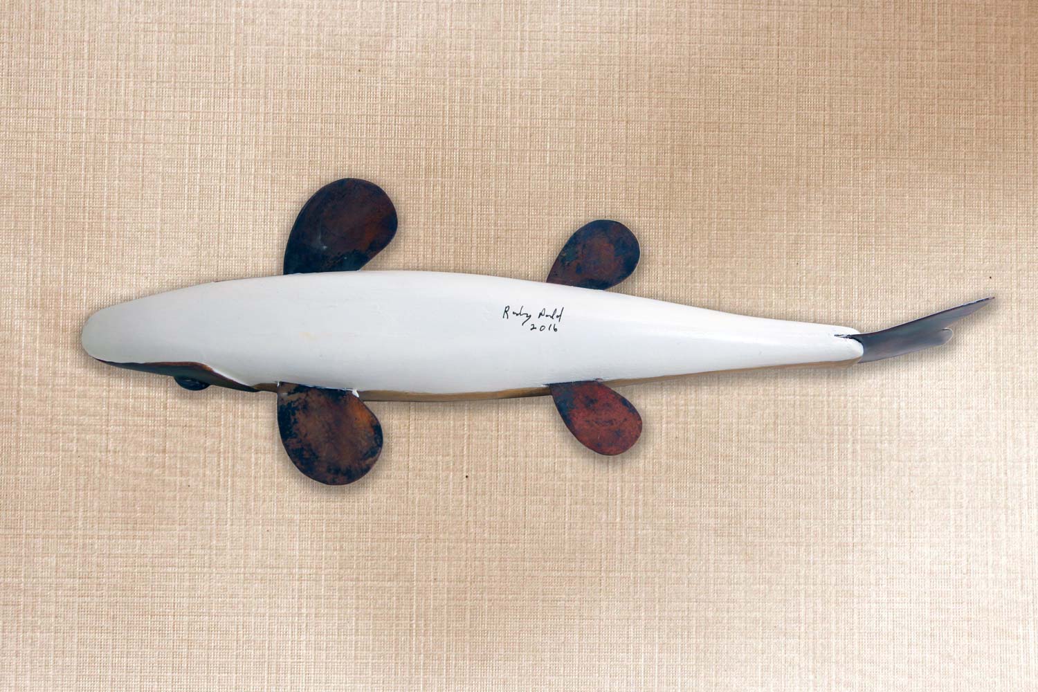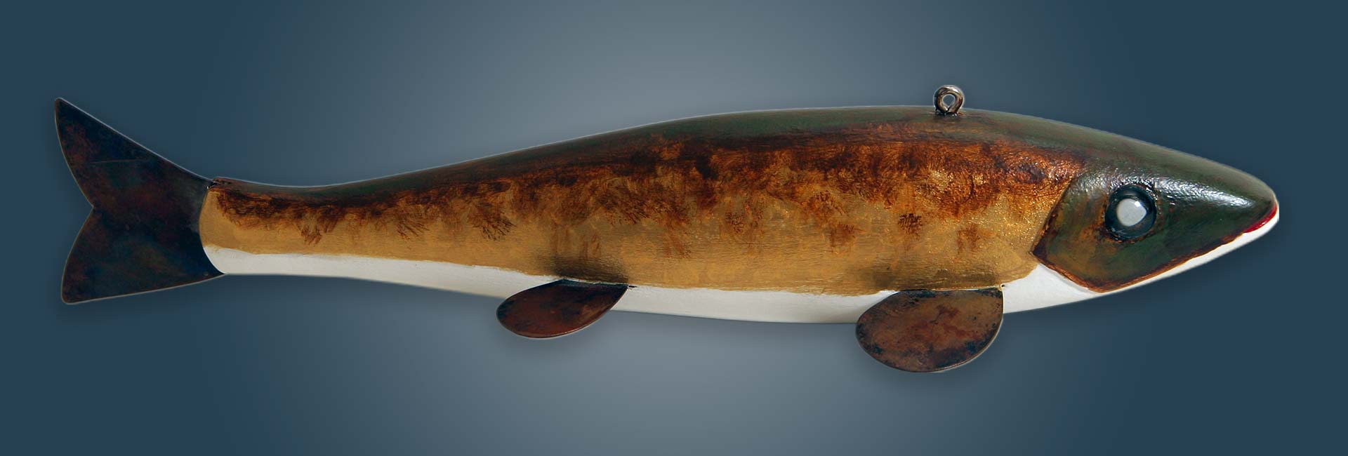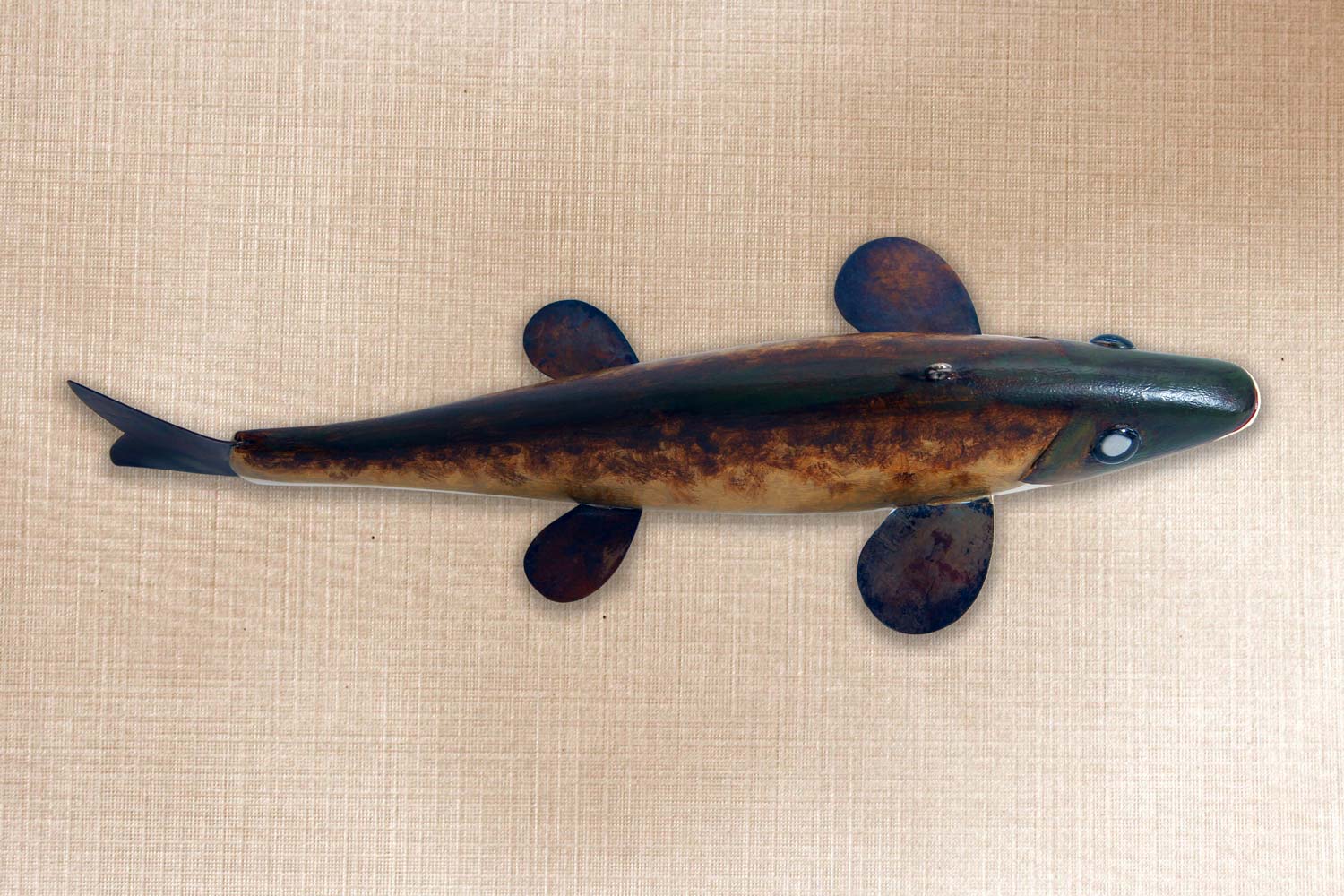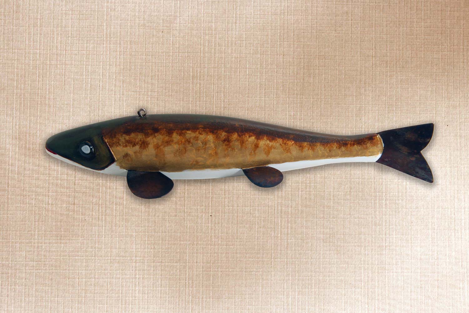 This fish is carved from basswood, Copper tail and fins, Glass eyes, Carved gills and mouth.