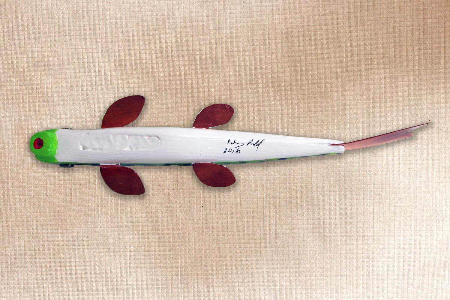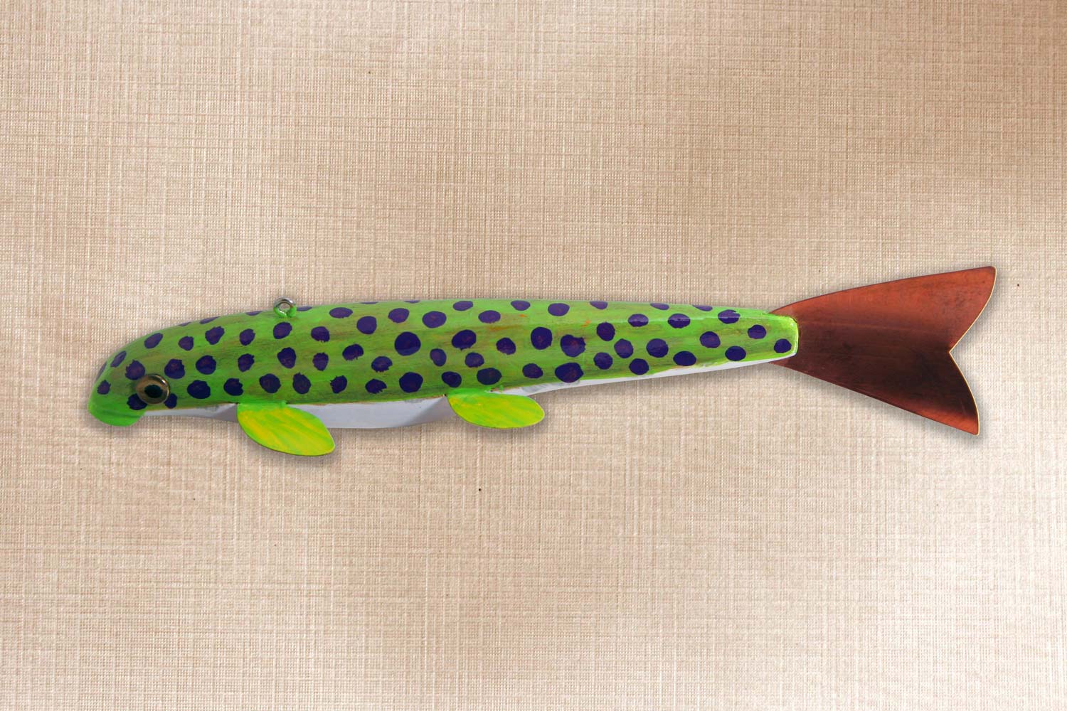 This fish is carved from pine, Copper tail and fins, Tack eyes, Carved mouth.